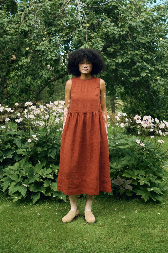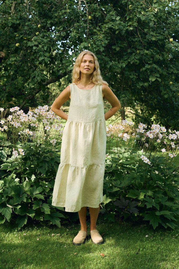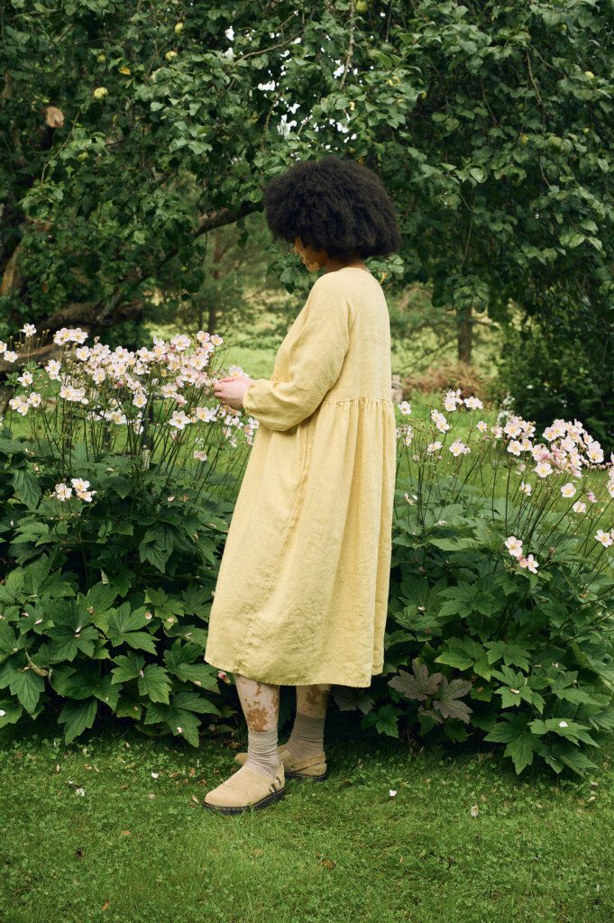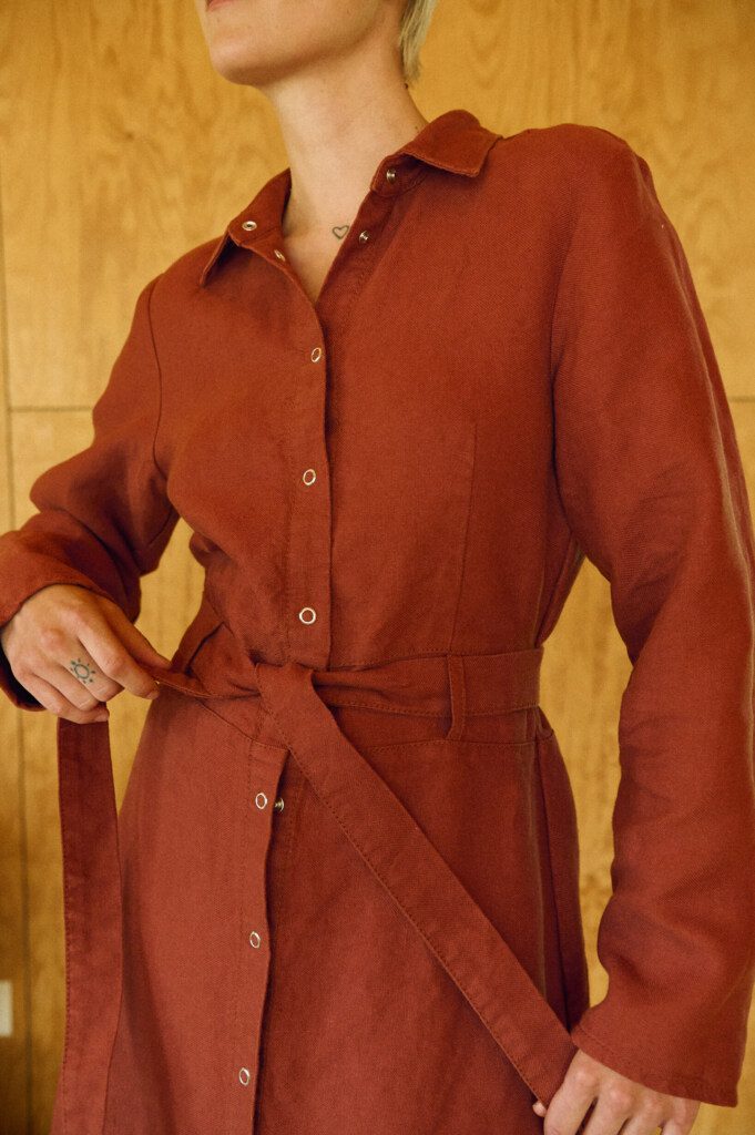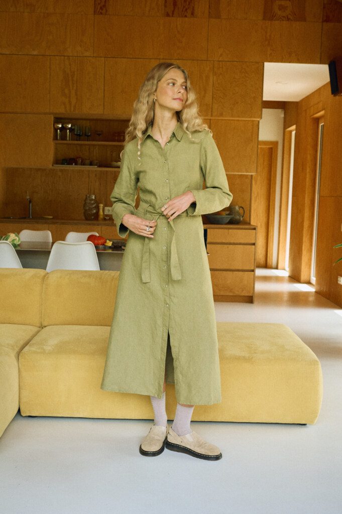 The Adele utility dress is made from heavy linen. It features long sleeves, a shirt collar, snap buttons, and a matching belt. This dress brings strong structure and smart tailoring. For a softer feel, choose Rina in a cotton-linen blend. It drapes gently, creases less, and still offers a defined silhouette. Both styles transition easily from early fall to cooler months, embodying women’s linen clothing choices for fall and beyond.