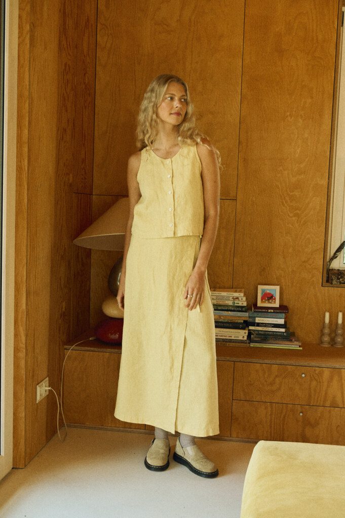 The Soli linen wrap skirt is all about comfort and minimalism. Made from medium-weight linen, it features a flat front, long side ties, and no hardware. Tie it high or low, depending on your mood. It moves beautifully and works well with boots, sandals, or sneakers.