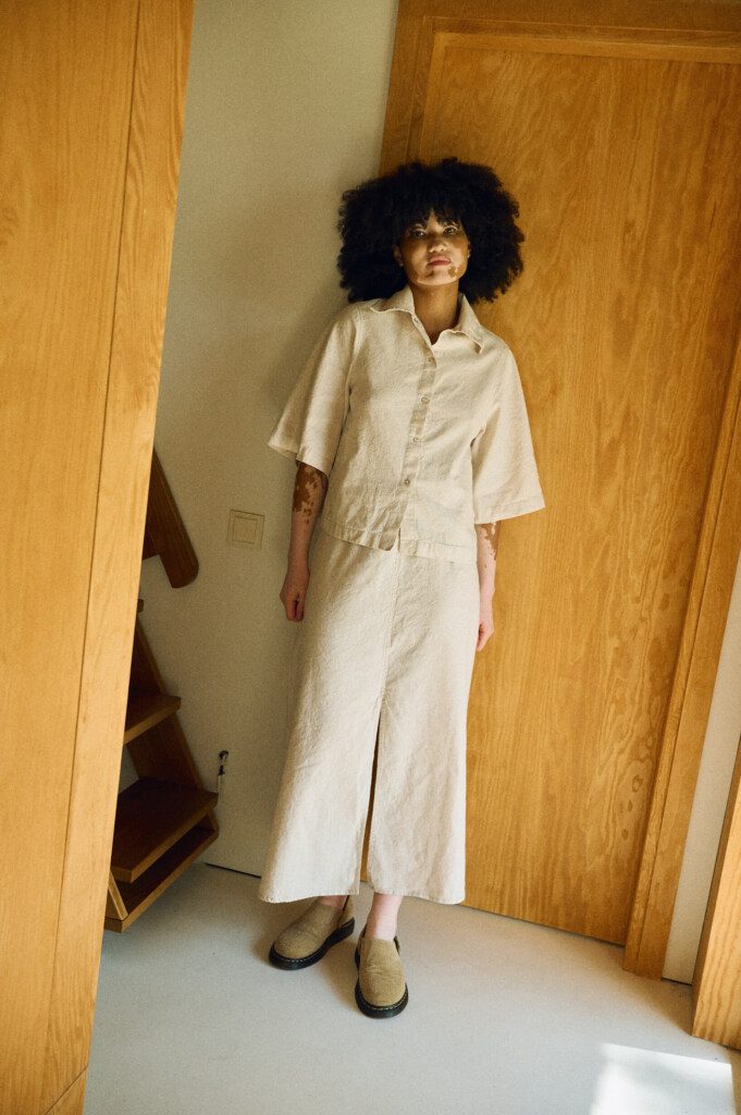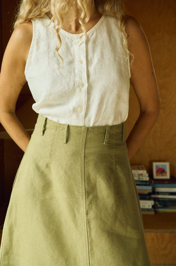 The Jovie linen utility skirt comes in heavy linen or cotton-linen blend. It features a flattering A-line shape, a front slit, high-rise waist, and a back zip closure. A clean front slit adds movement and a subtle detail. The matching belt lets you style it your way. This skirt feels sturdy like denim but breathable like linen. Dress it up or down — it works in any season.