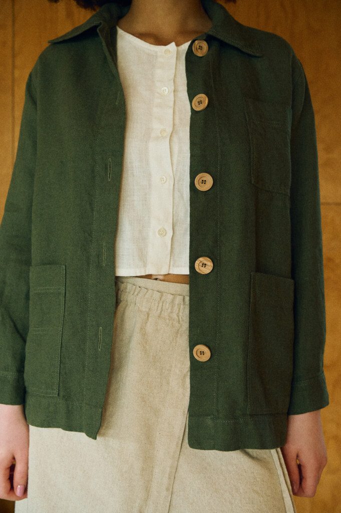 The Andrea shirt jacket design will offer a boxy fit, dropped shoulders, and snap-button closure make it a capsule wardrobe staple. Throw it over a tee or layer it under a coat when the temperature drops. Available in cotton-linen blend or heavy linen.