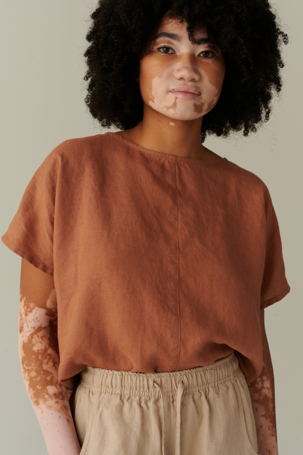 model wearing terracotta linen shirt and trousers in a summer garden