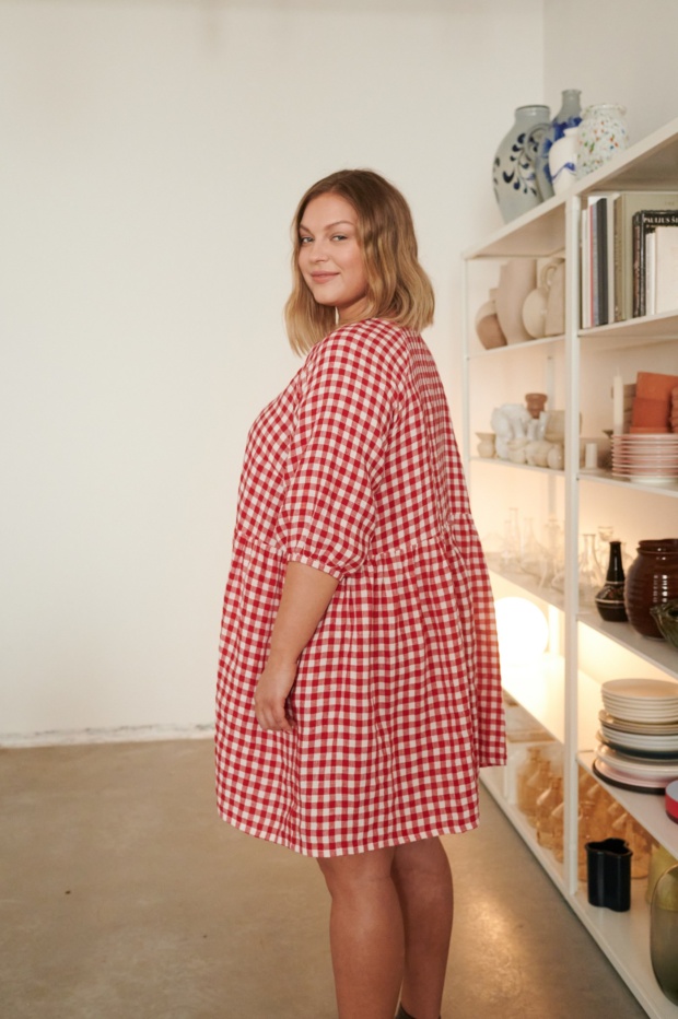 A tight or slim fit may lead to unwanted wear or thinning out. Tension in the fabric may loosen the seams, so it is important that the garment does not feel tight around the bust, shoulders, and arms. Linen is a woven non-stretchy fabric, and some ease is highly important so you can move in the garment.