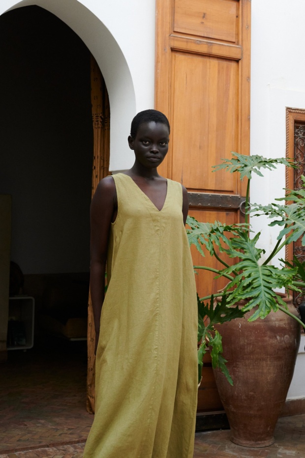 Sleeveless midi wrap dress Nuria. The linen summer dress features a deep V-neckline and a thin, long belt to wrap around the waist. Chest darts are included accentuating the silhouette. Deep side slits to reveal more skin. Functional inseam pockets. Lightweight, breezy, and all-natural – a wonderful choice for summer.