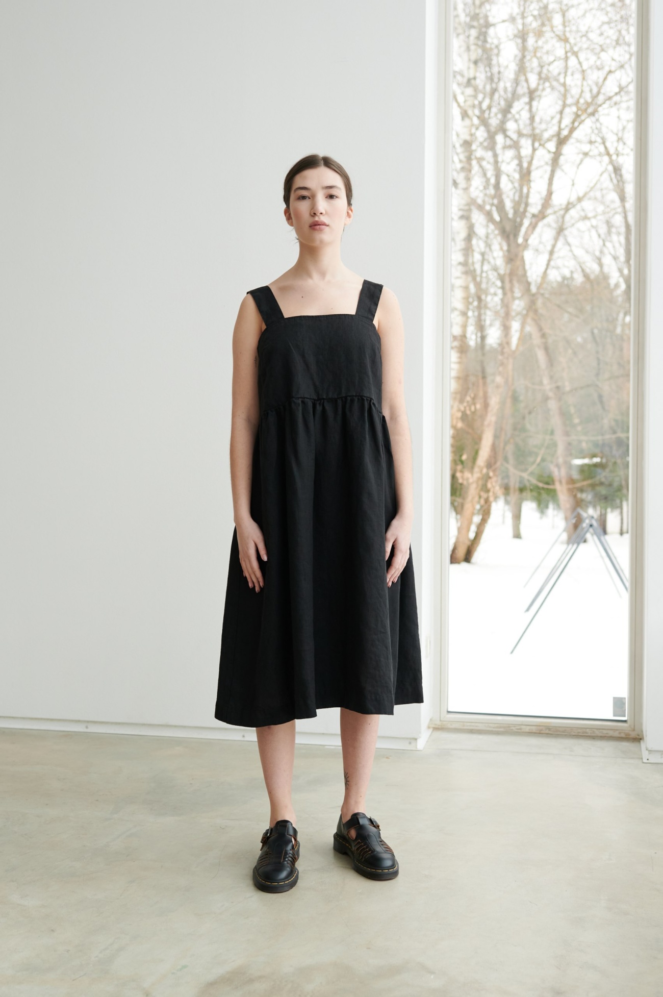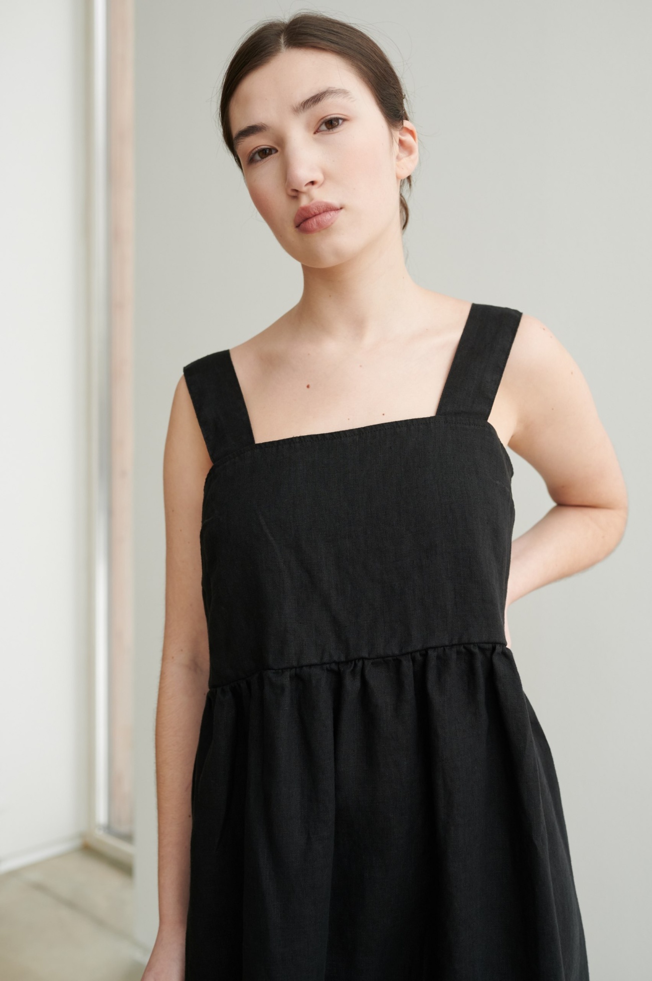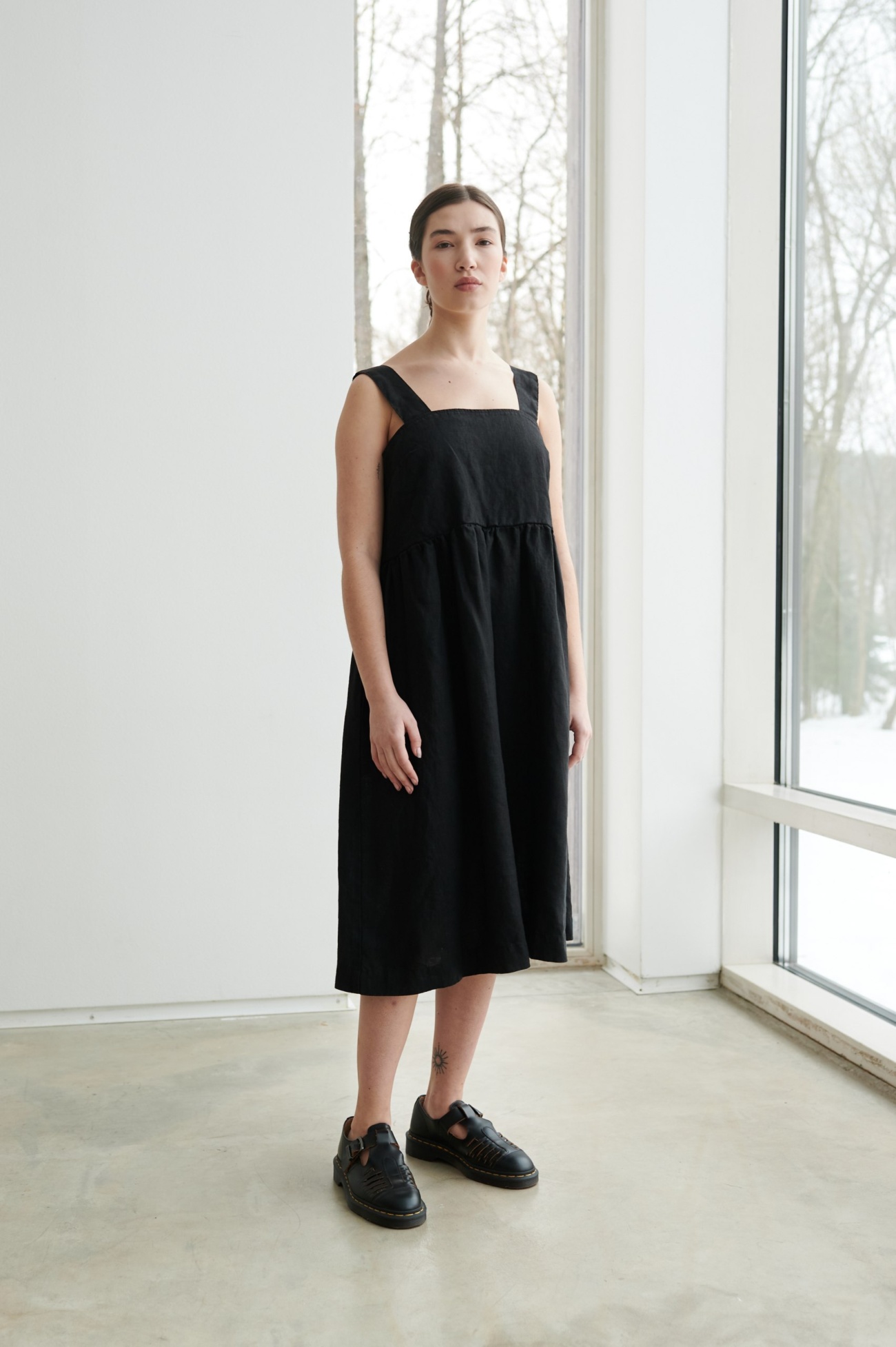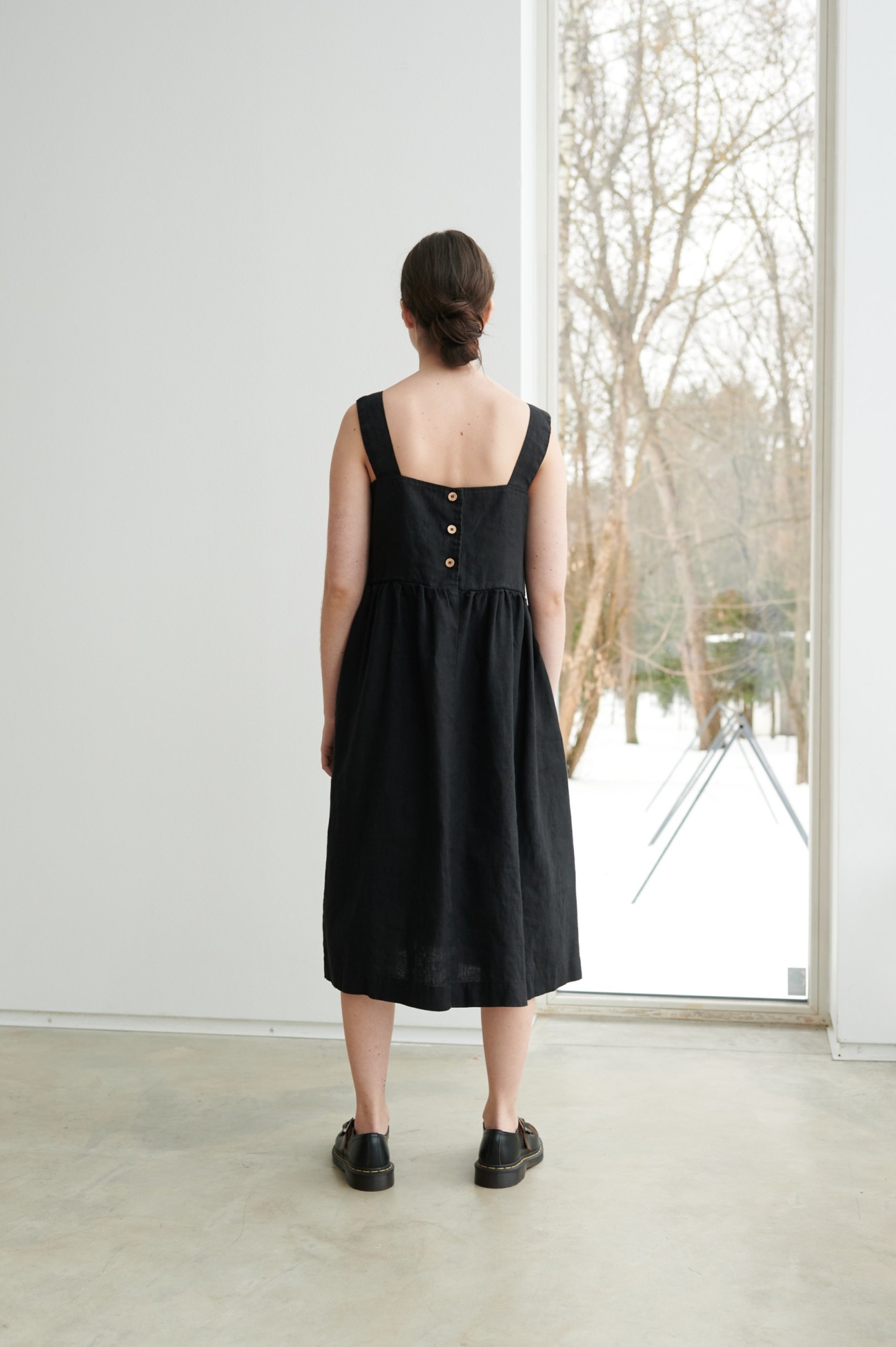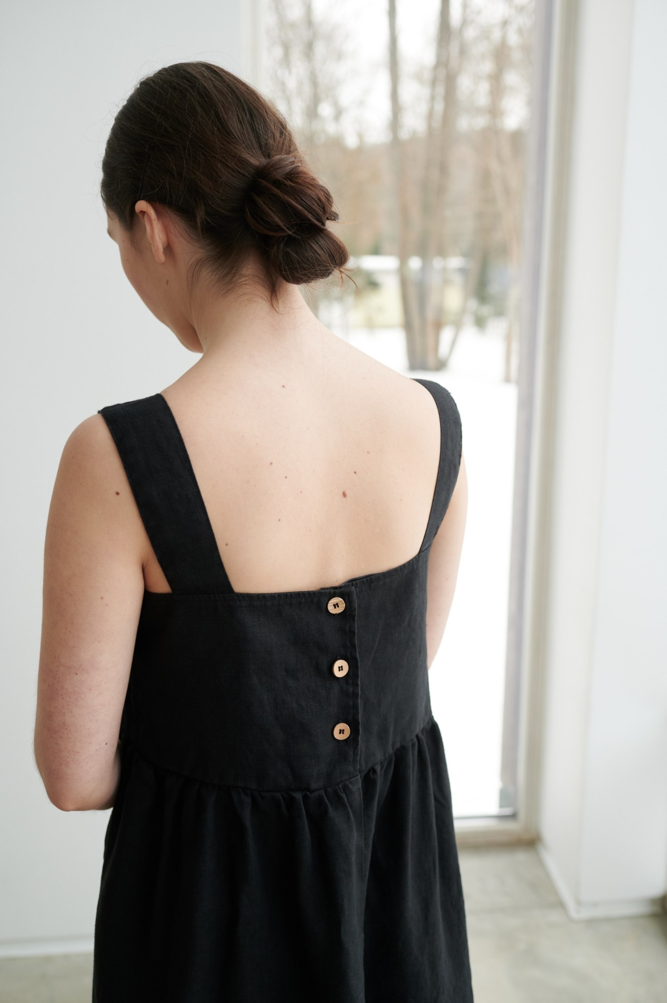 This bra-friendly Summer dress is an outfit on its own, and you can tweak it easily by adding accessories or simply layering it with a T-shirt or a fitted turtleneck. On hot days, you may appreciate the shoulder-revealing bodice and the swingy skirt letting you get lots of sunshine and air around the body.
