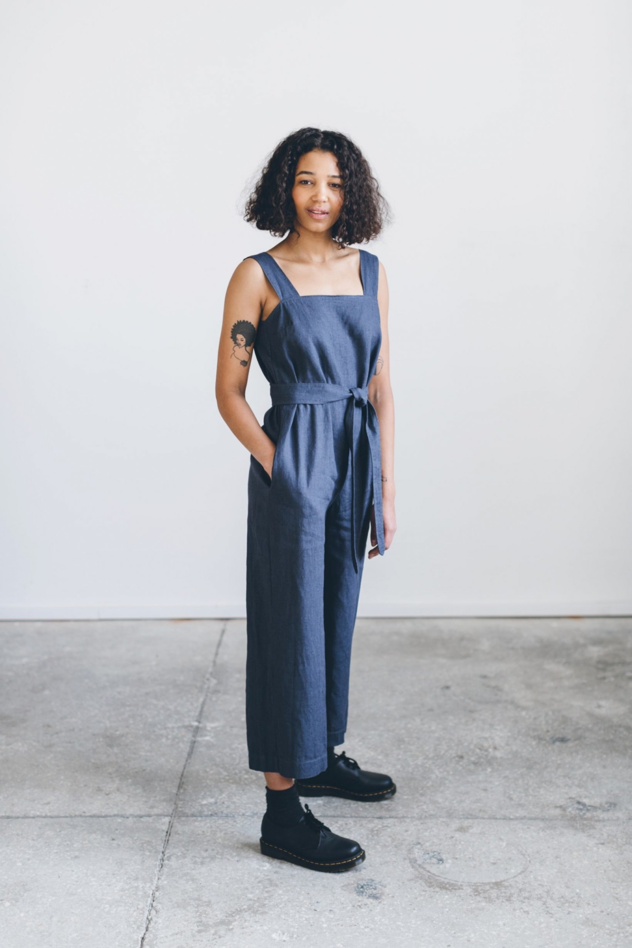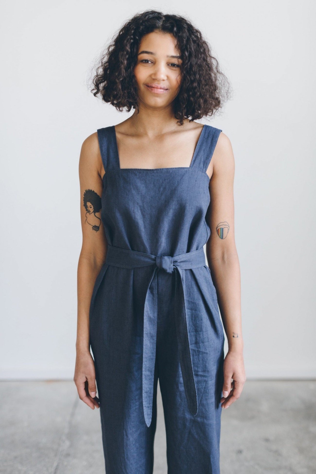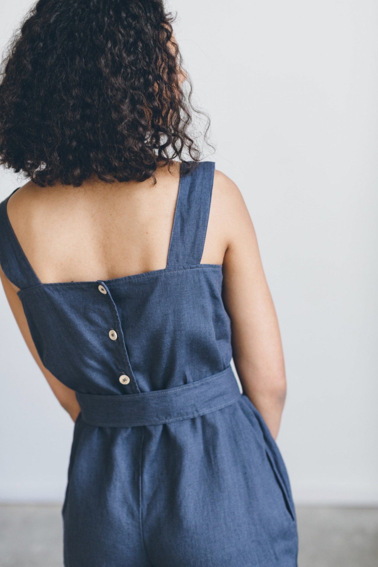 Sleeveless linen jumpsuit called Naomi. Wide shoulder straps, cropped legs, and a detachable belt to accentuate the waist. Secured with a three-button closure at the back. Lightweight, easy to wear, and perfect for summer. Side seam pockets to carry the essentials. Available in various colors.