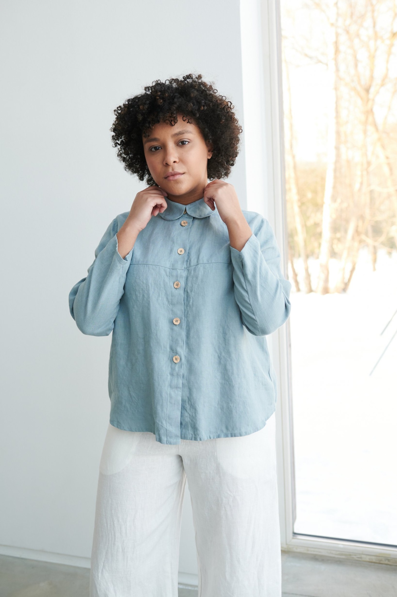 The Brandi linen shirt is a loose-fitting piece in a timeless and casual design. It features slightly cropped sleeves, a round collar, and a gently curved hem. Wooden button closure to make the shirt more classy and feminine. This piece can be worn layered under a blazer or easily tucked into jeans for a more laid-back look.
