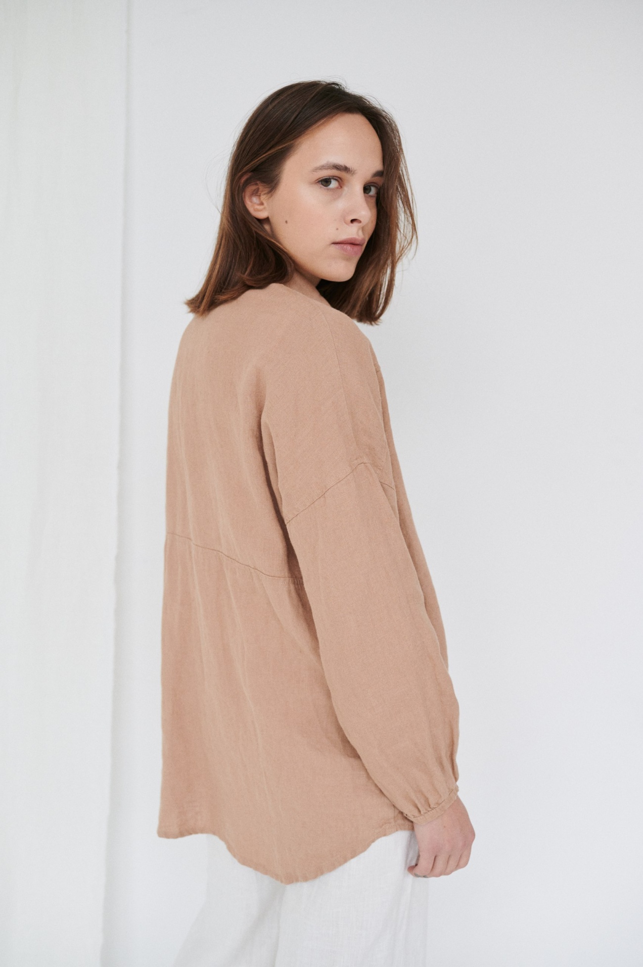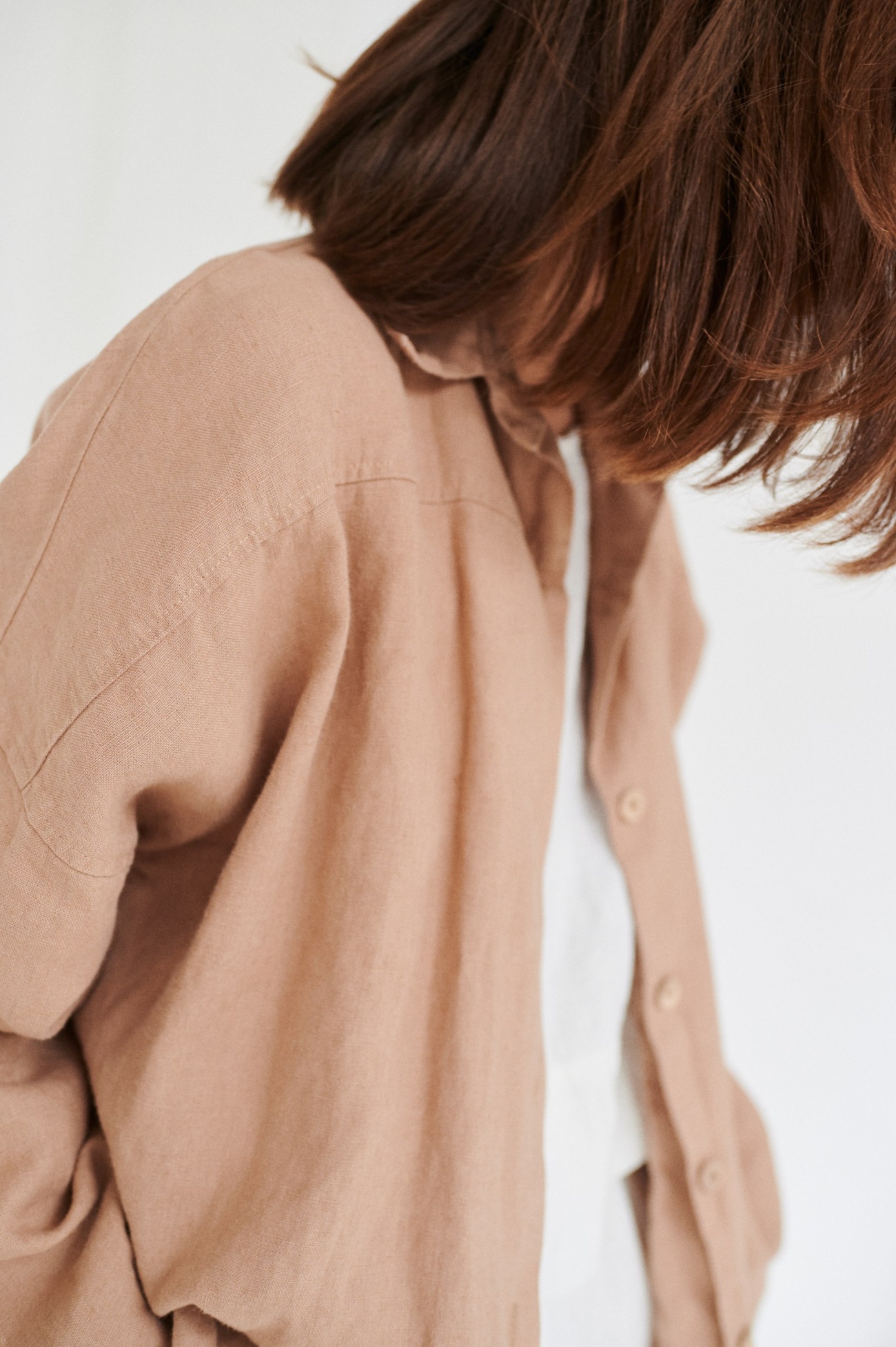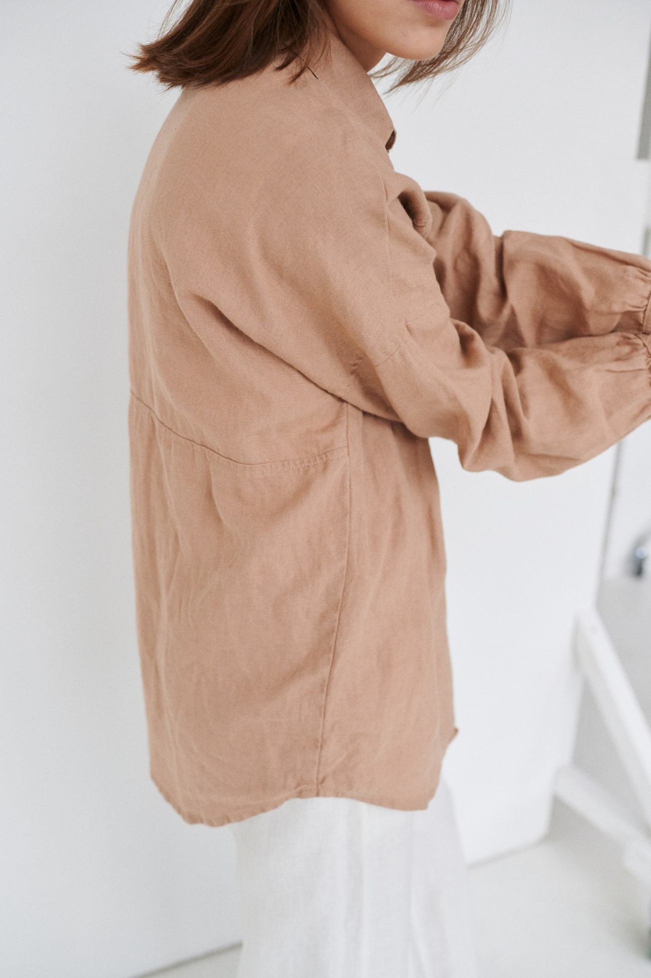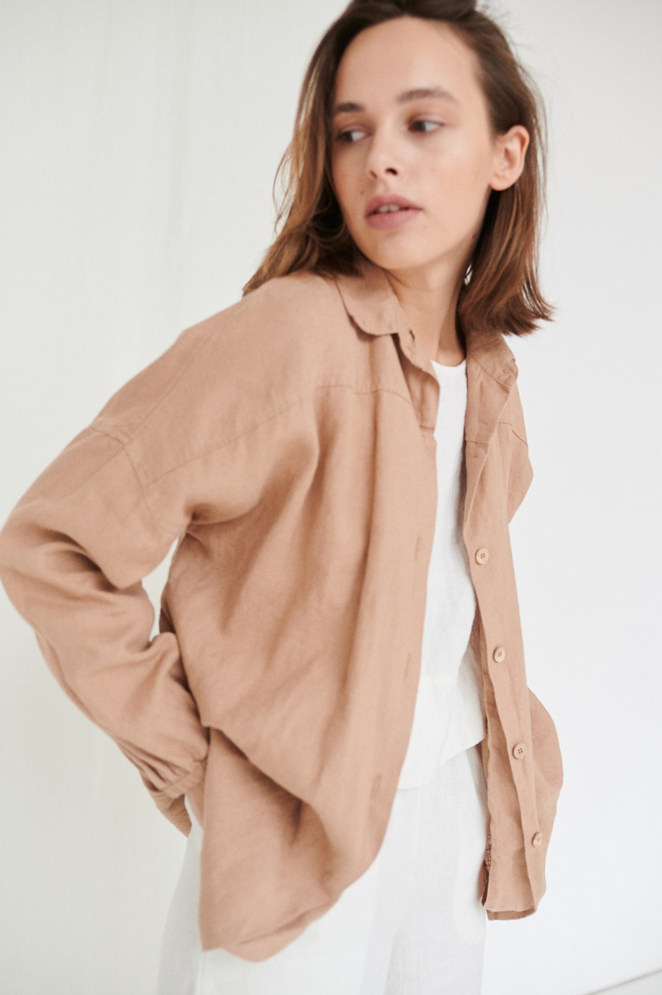 Linen button down shirt named Lyn. Loose-fitting cut, a regular collar and full length sleeves with ruched cuffs. High-low curved hem that is perfect for spring/fall weather. A flowy silhouette for maximum comfortability and everyday wear. Natural wood buttons, giving the shirt a unique finish. Available in various colors for everyone’s taste.