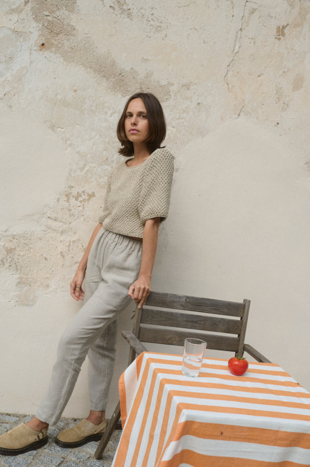 Linen is a delicate fabric. With every wear, it gets looser and softer. If you choose a linen garment in which you sit a lot, it is possible that the part on which you sit gets thinner over time. Perspiration also affects the fabric, so it is important to keep the garment clean.